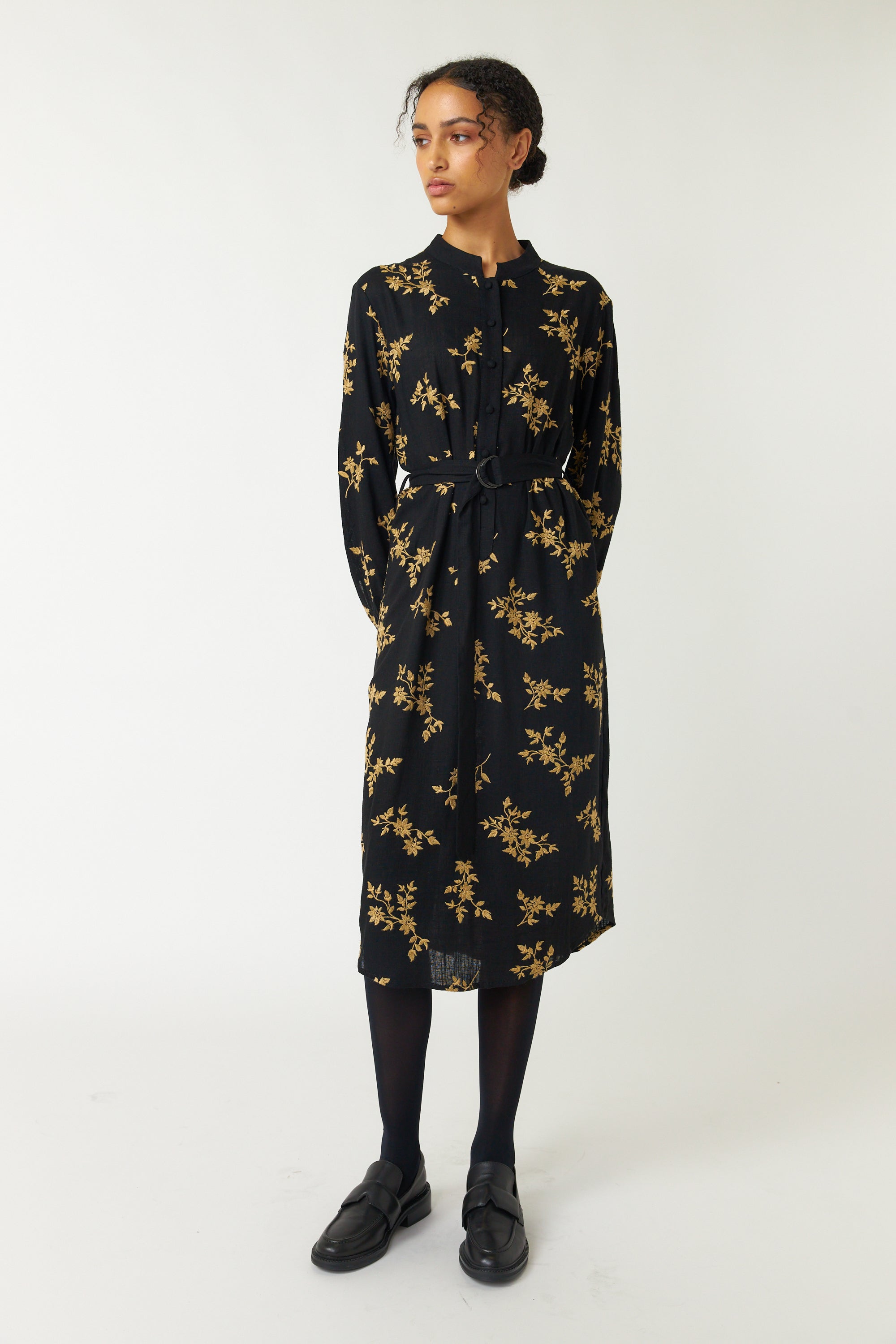 Our Blooms shirt dress is elevated with an elegant blooms embroidery. It features a collar stand and button placket through to waist. This dress is mid calf length and comes with a matching belt and sleeves that gather onto a tailored cuff. This is a dress that can effortlessly take you from café to work and then onto a dinner out.