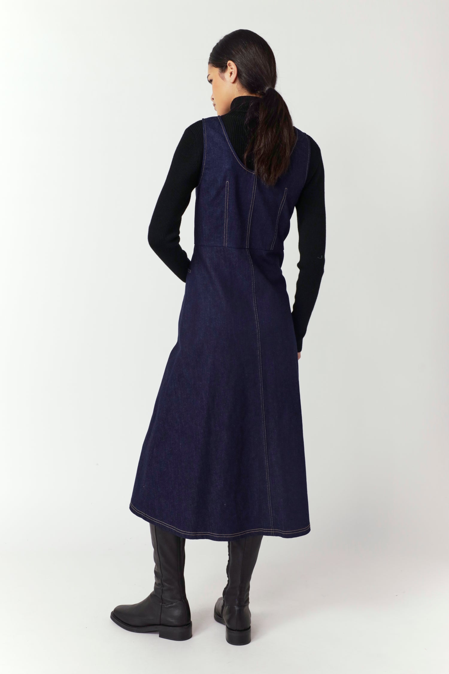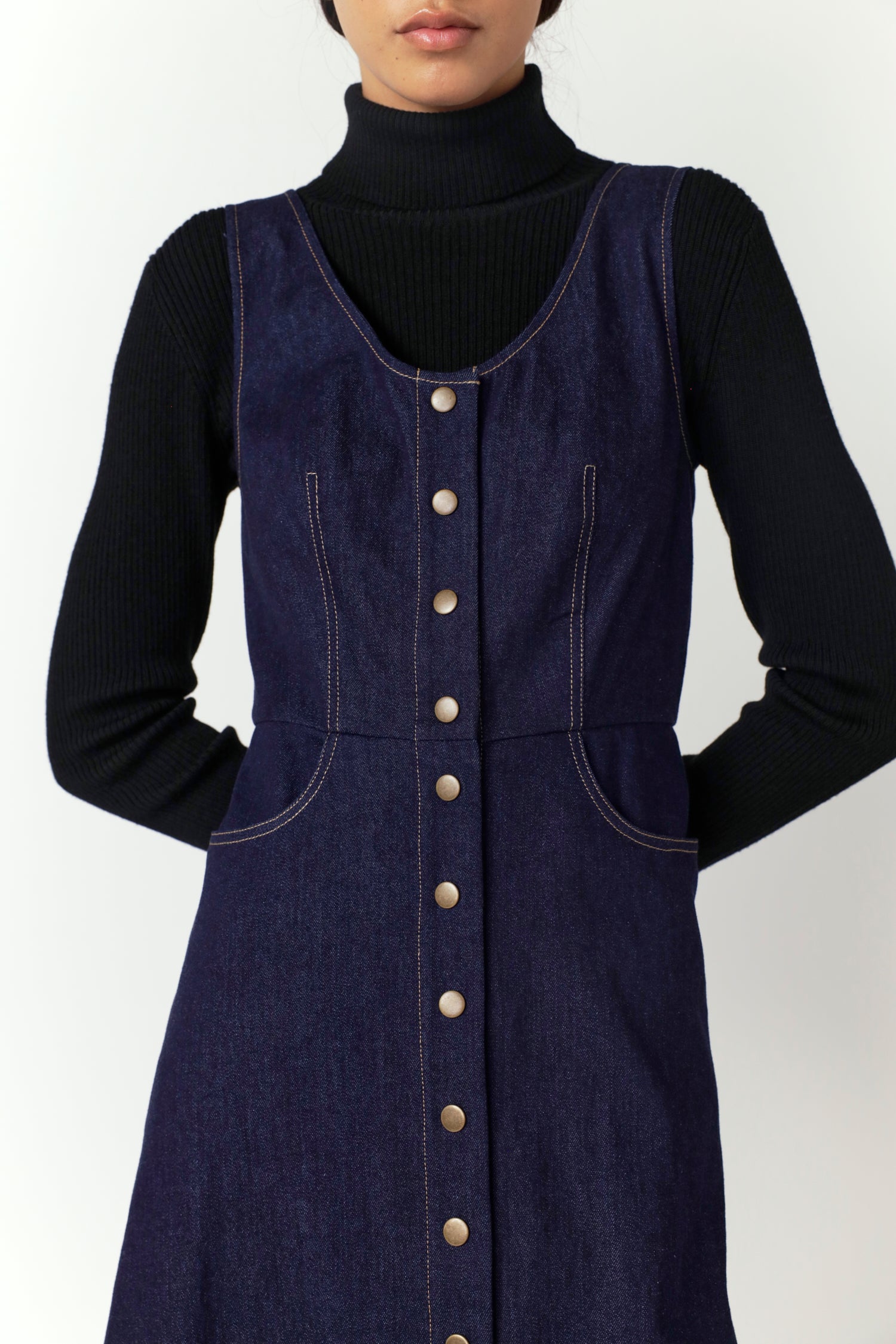 A Sylvester classic, the Denim dome dress is a midi-length style with top-stitch detailing featuring a scooped neckline, snap button-through front and two front pockets. Wear on its own or layer over the Merino to ease into the cooler months.