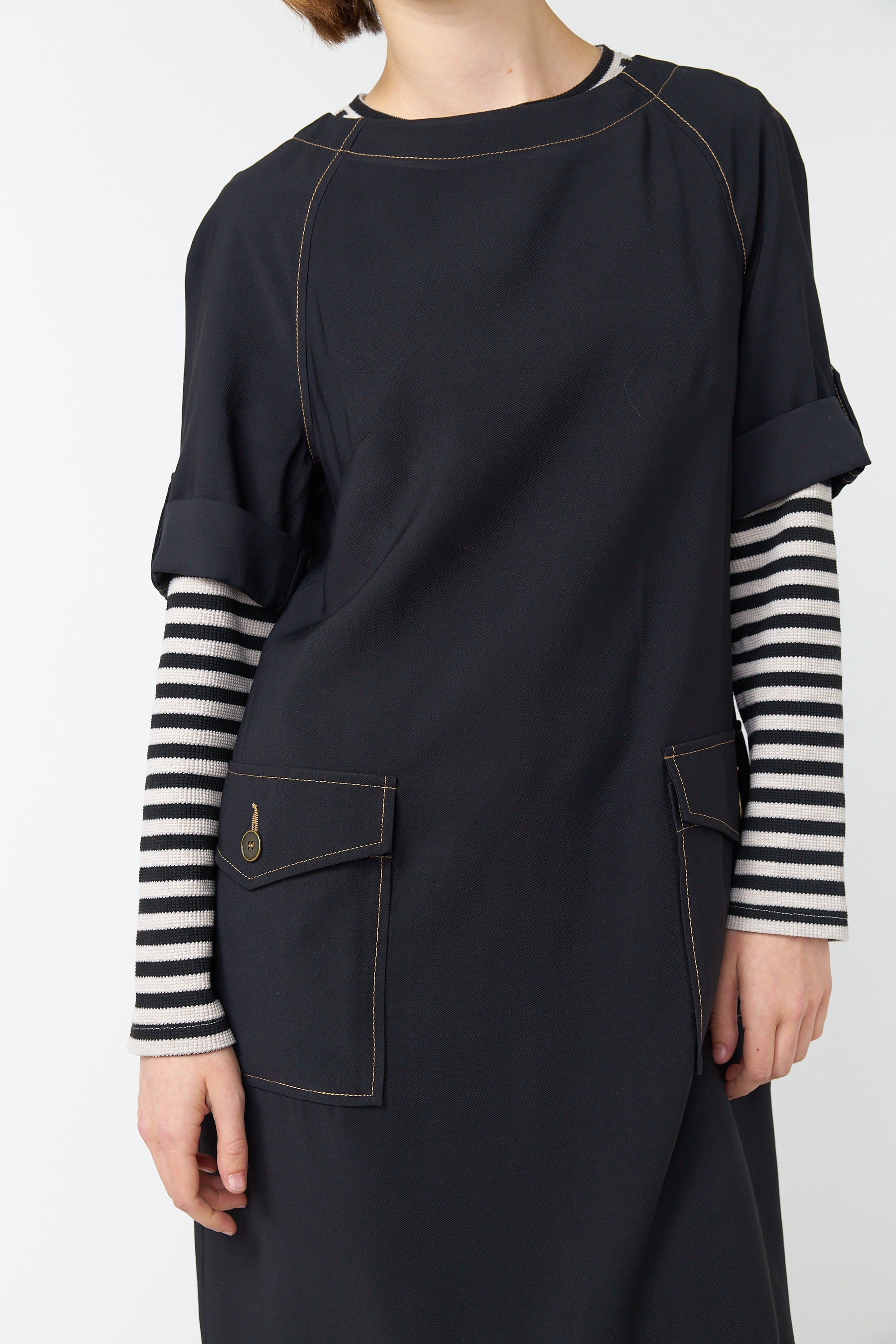 The Traveller sack dress is a relaxed shift style dress that falls to the knee. Featuring a flattering boat neckline, short rolled sleeves, front patch pockets and contrast stitching. Layering it with our makes it a great transeasonal piece.Lola is 5'7 and wears size 6.