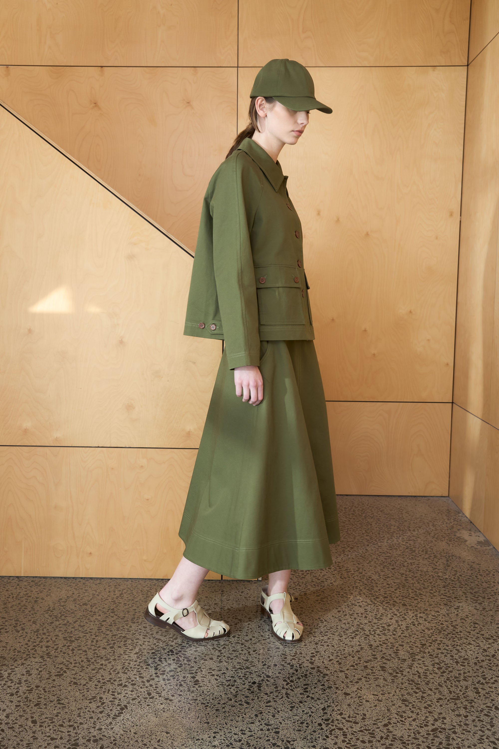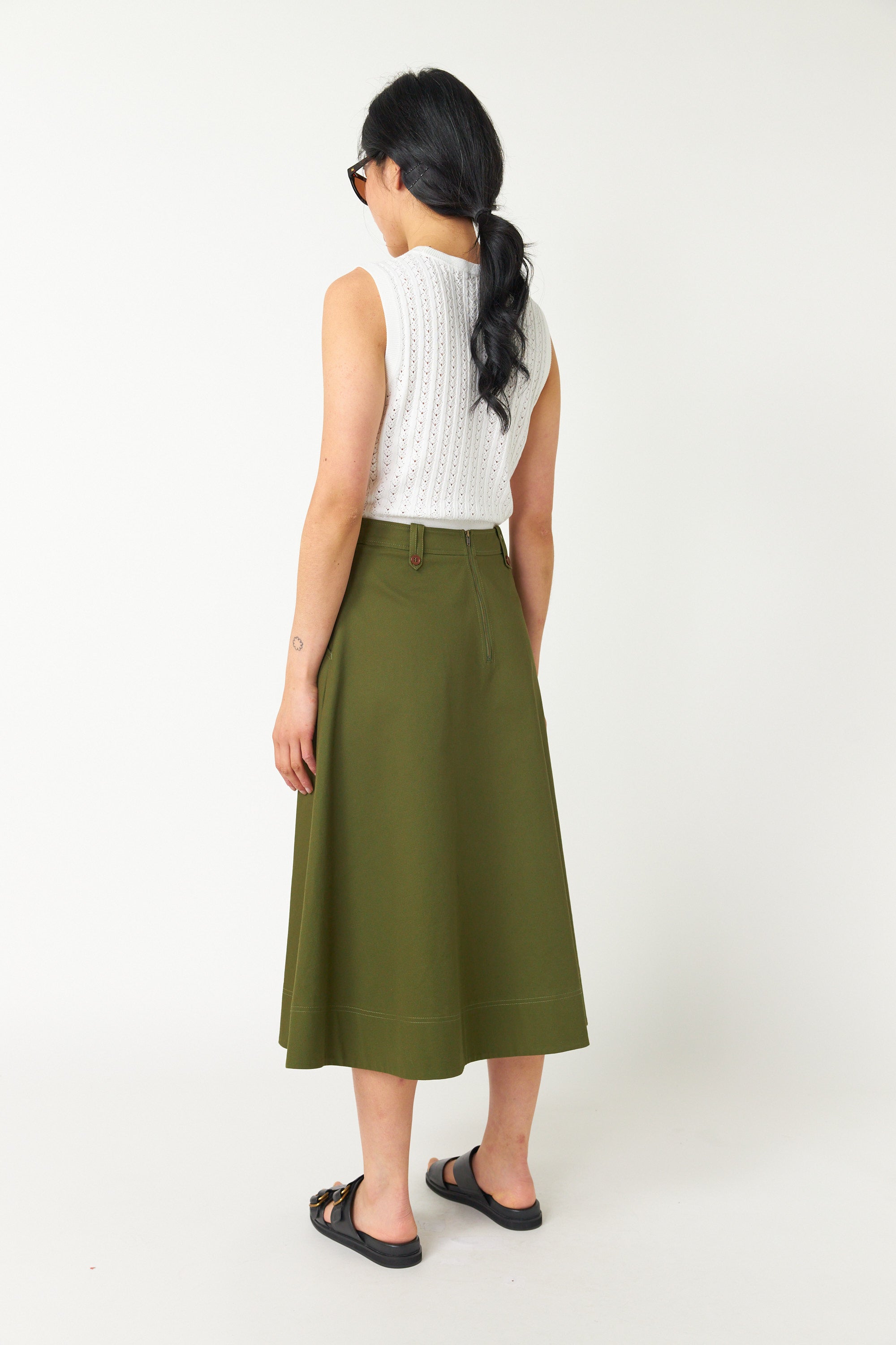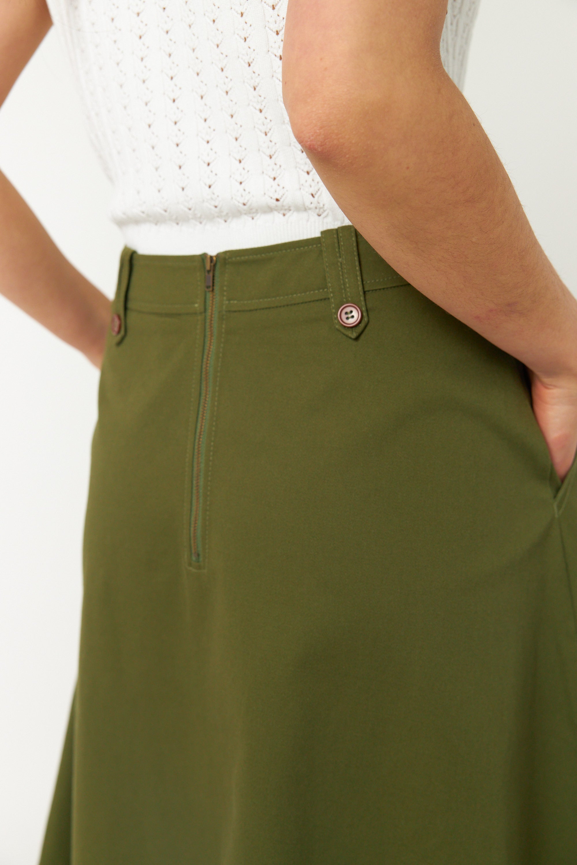 Our Workwear skirt is very flattering. Made of 100% cotton, this skirt features contrast buttons on belt loops, a rear zip closure, and helpful angled front pockets. We suggest pairing with the or for those glorious spring days, it also makes a great suit with the matching and .